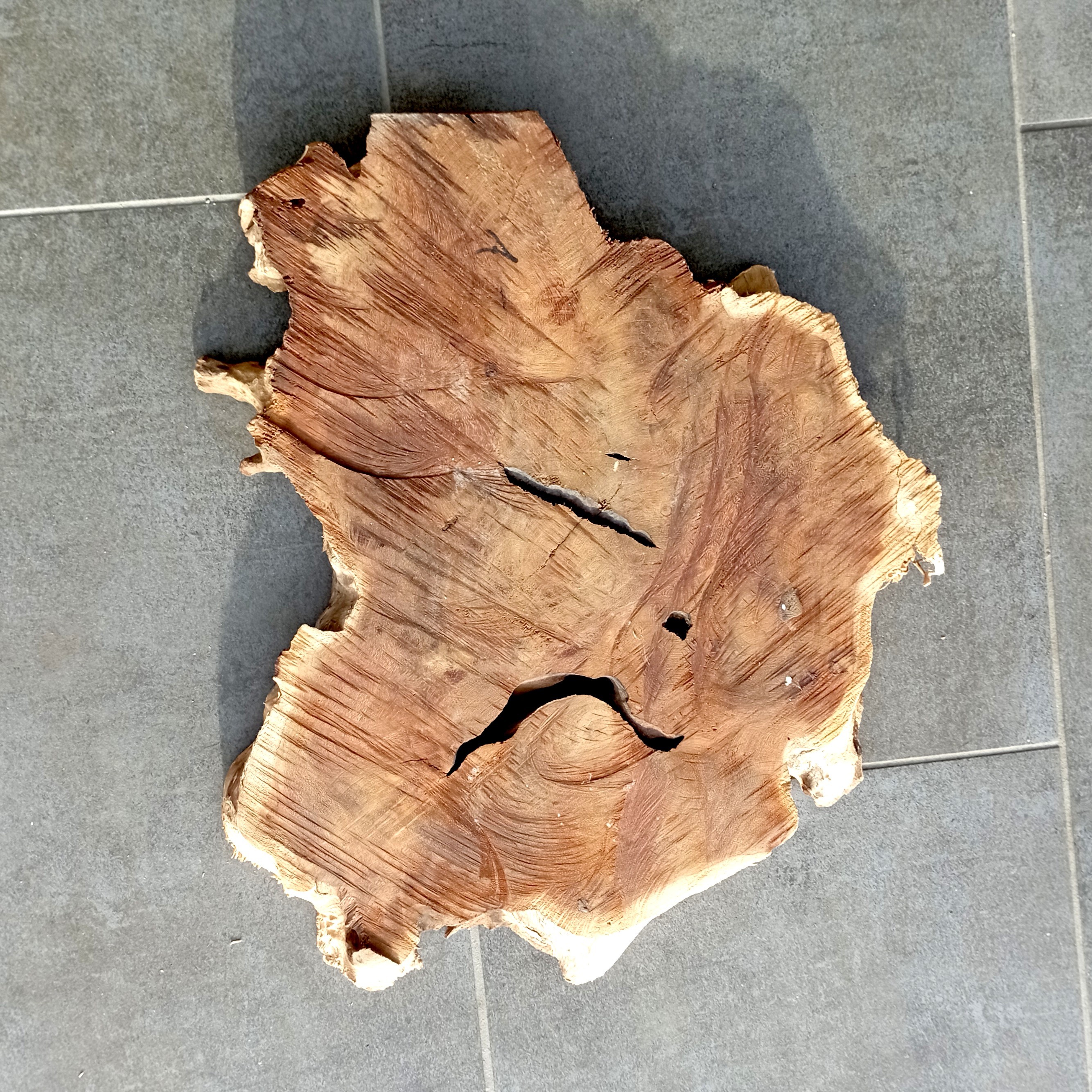 Taillée dans un tronc de teck abattu par les tempêtes, cette tranche de bois fera un superbe plateau ou une étagère très atypique.