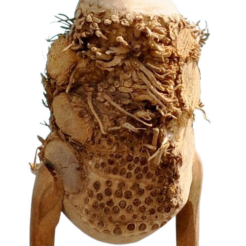 La tête et les pattes ont été sculptées à la main dans du bois de teck. Le corps lui est en racine de bambou. La dernière photo montre la racine de bambou taillée mais avant ponçage.