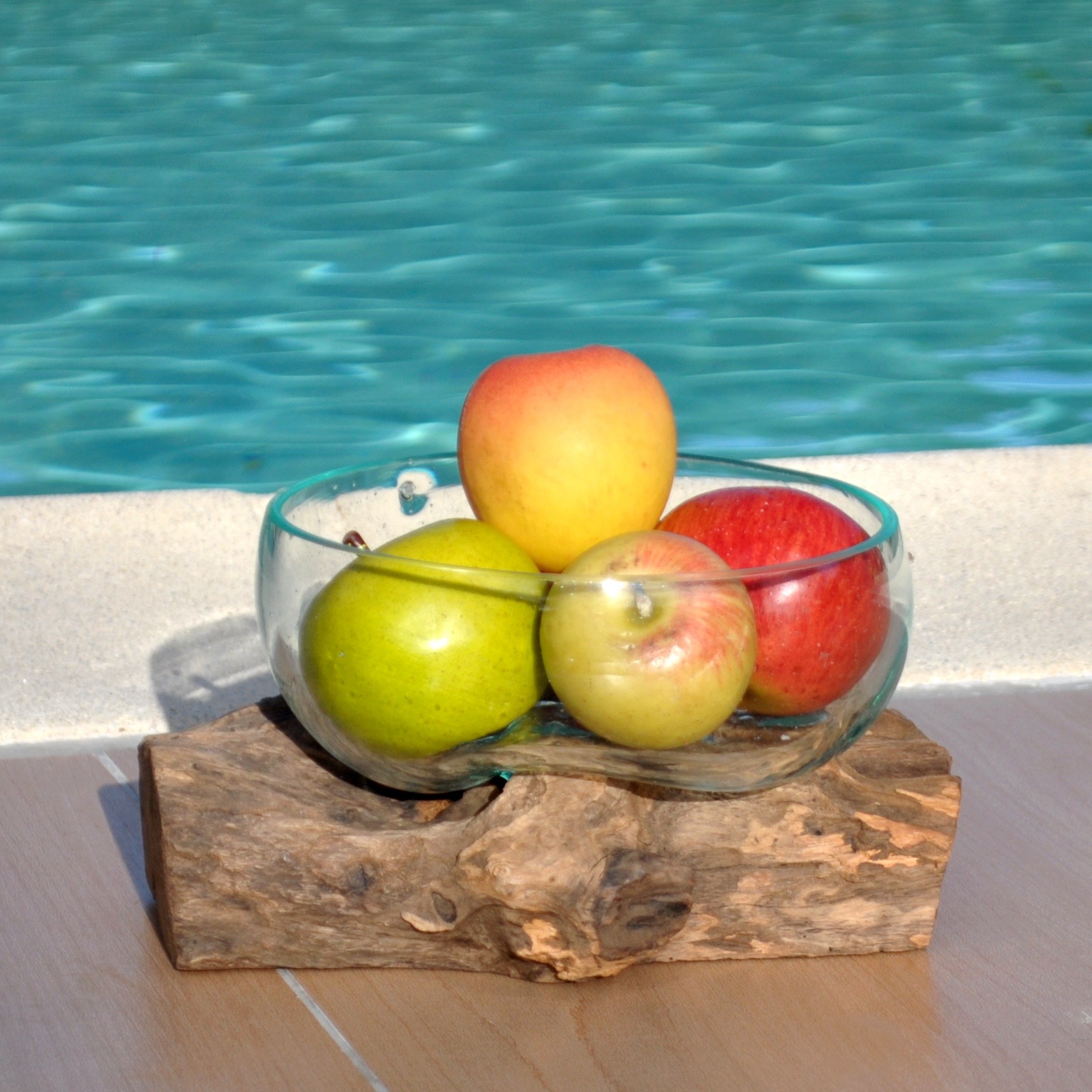 La pâte de verre provient de verre recyclé et est soufflée en fusion, directement sur du bois de Teck recyclé lui aussi.