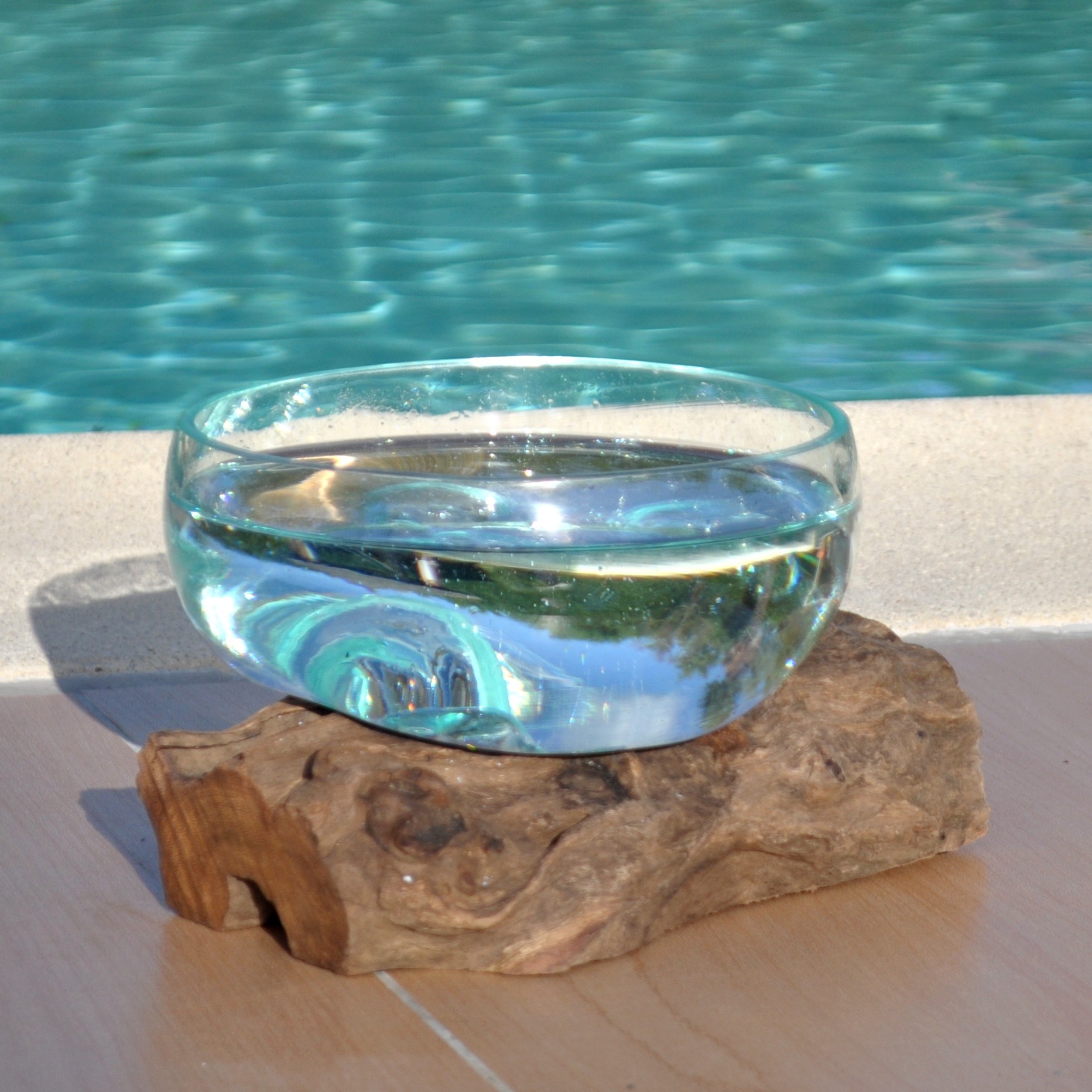 Soufflé artisanalement sur le bois sculpté par la nature, le verre en épouse la forme, donc chaque pièce est absolument unique.