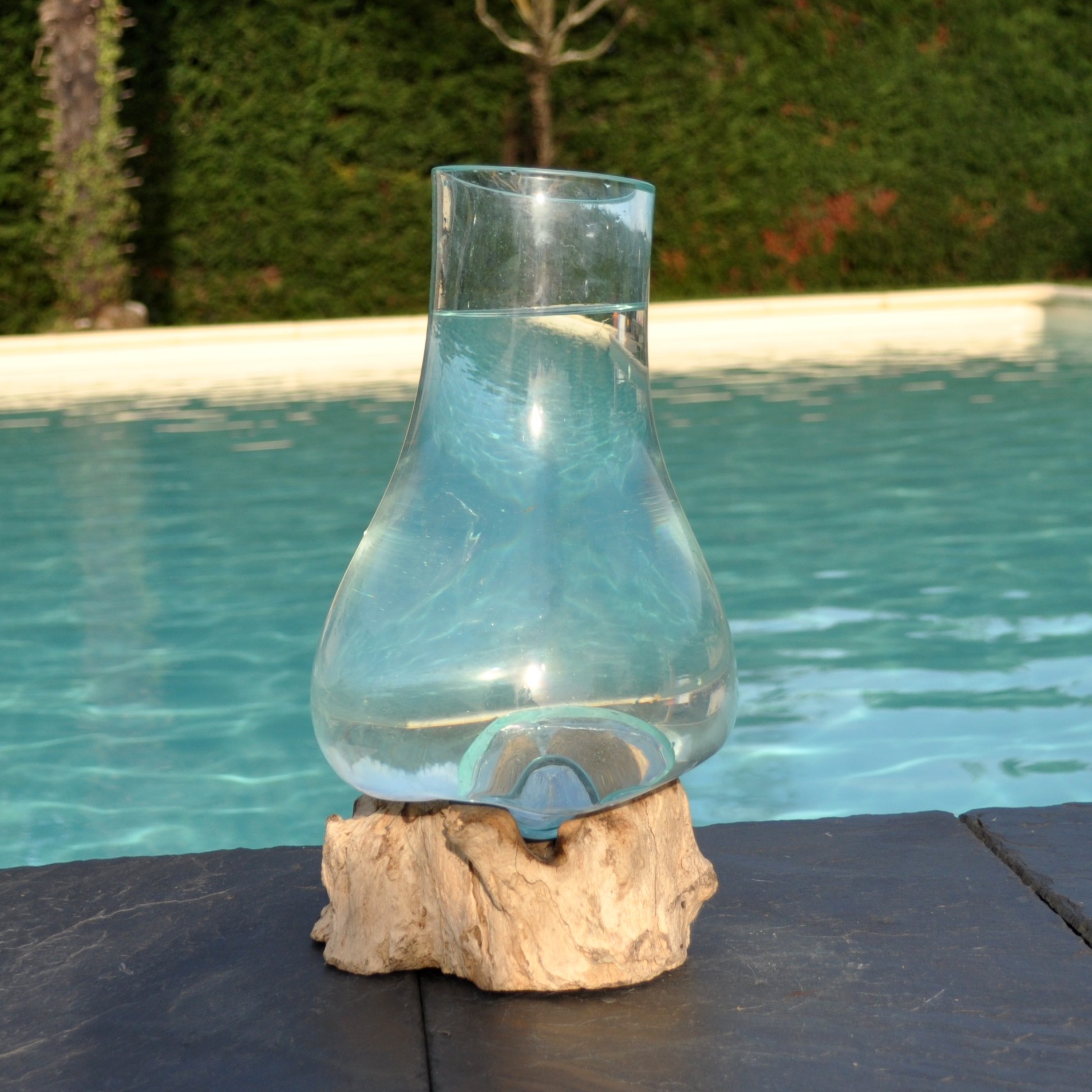 La pâte de verre provient de verre recyclé et est soufflée en fusion directement sur le bois.