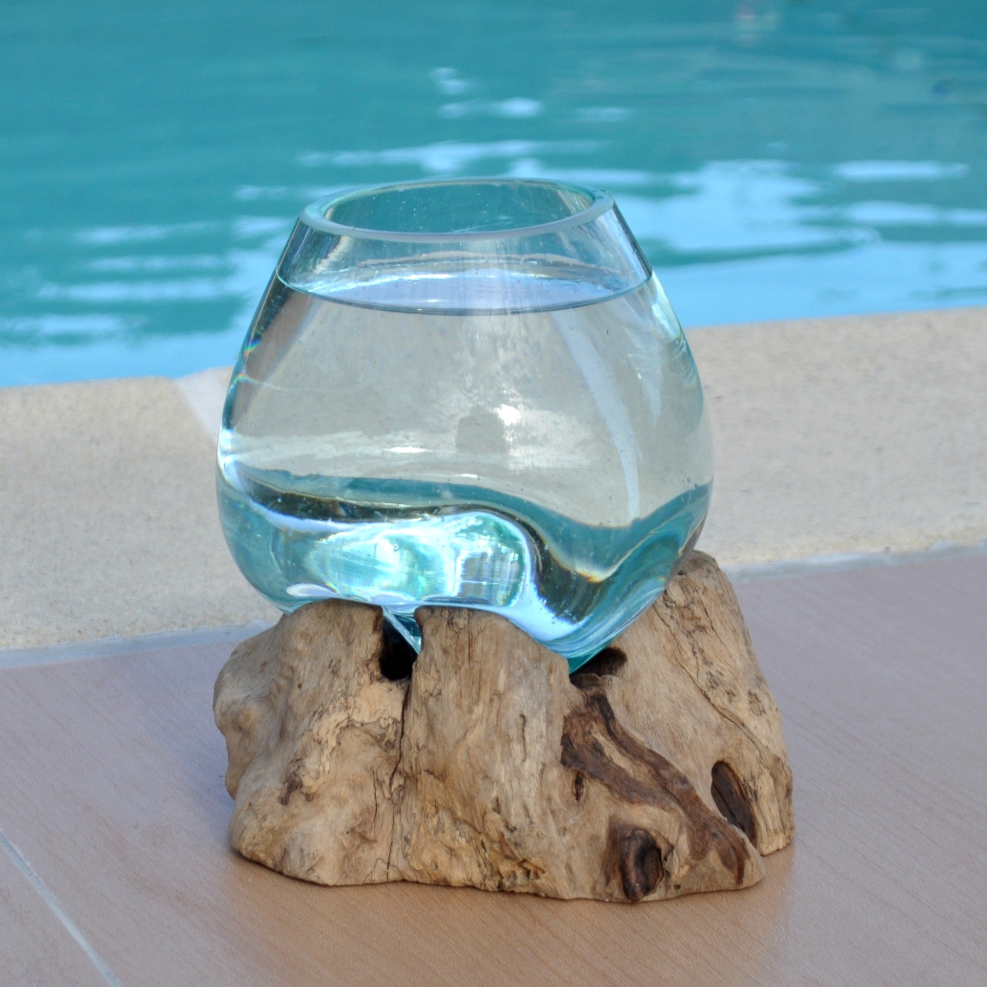 La pâte de verre provient de verre recyclé et est soufflée en fusion directement sur le bois.