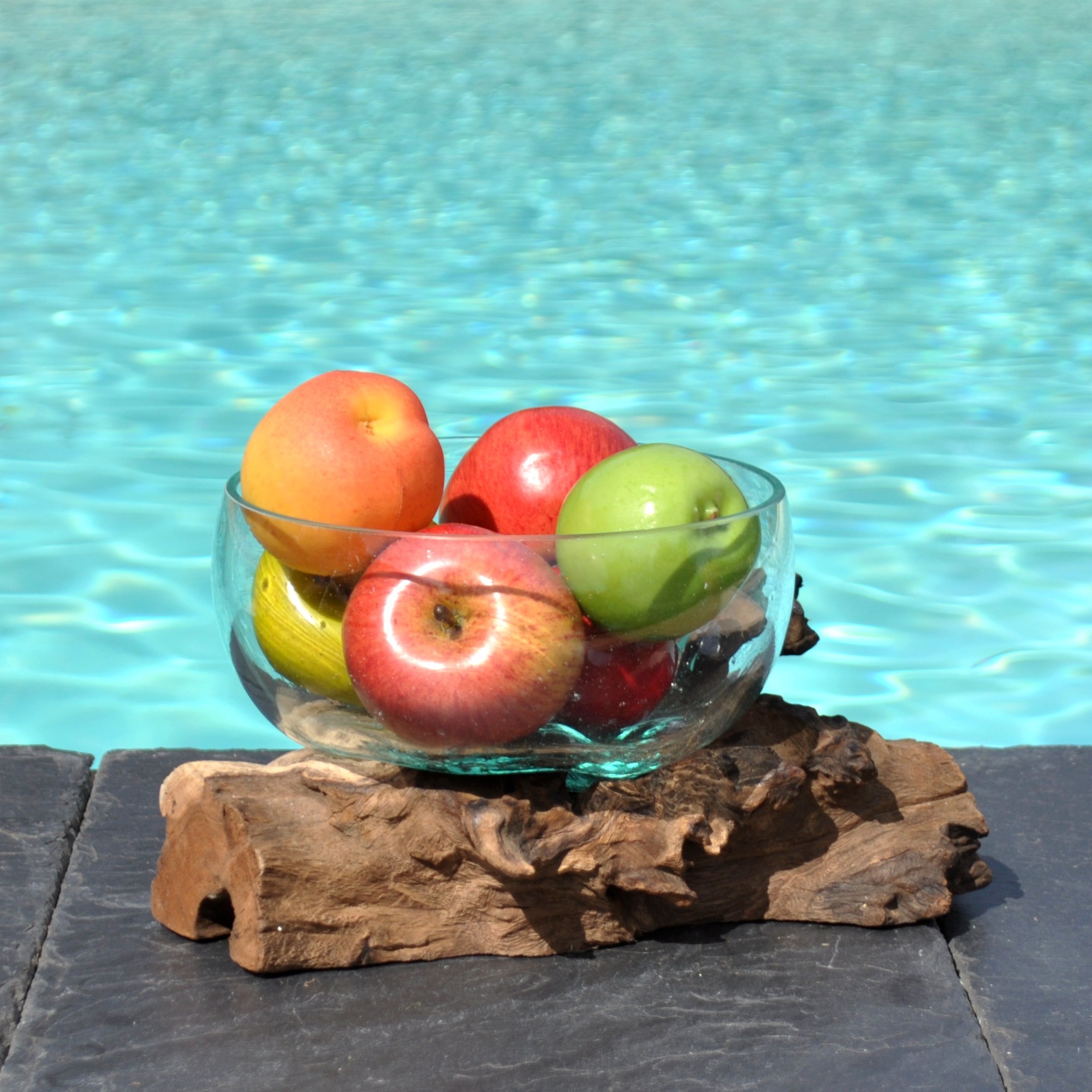 La pâte de verre provient de verre recyclé et est soufflée en fusion, directement sur du bois de Teck recyclé lui aussi.