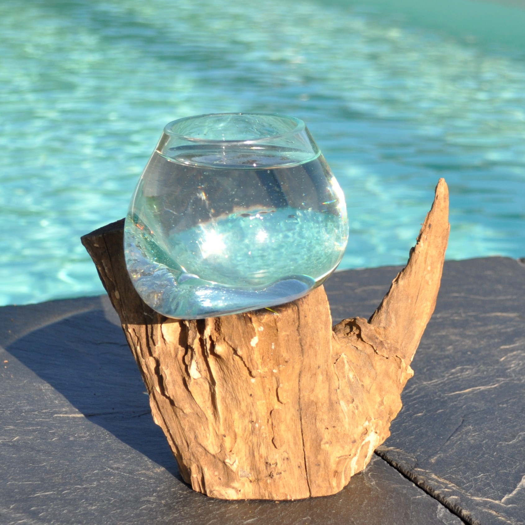 La pâte de verre provient de verre recyclé et est soufflée en fusion directement sur le bois.