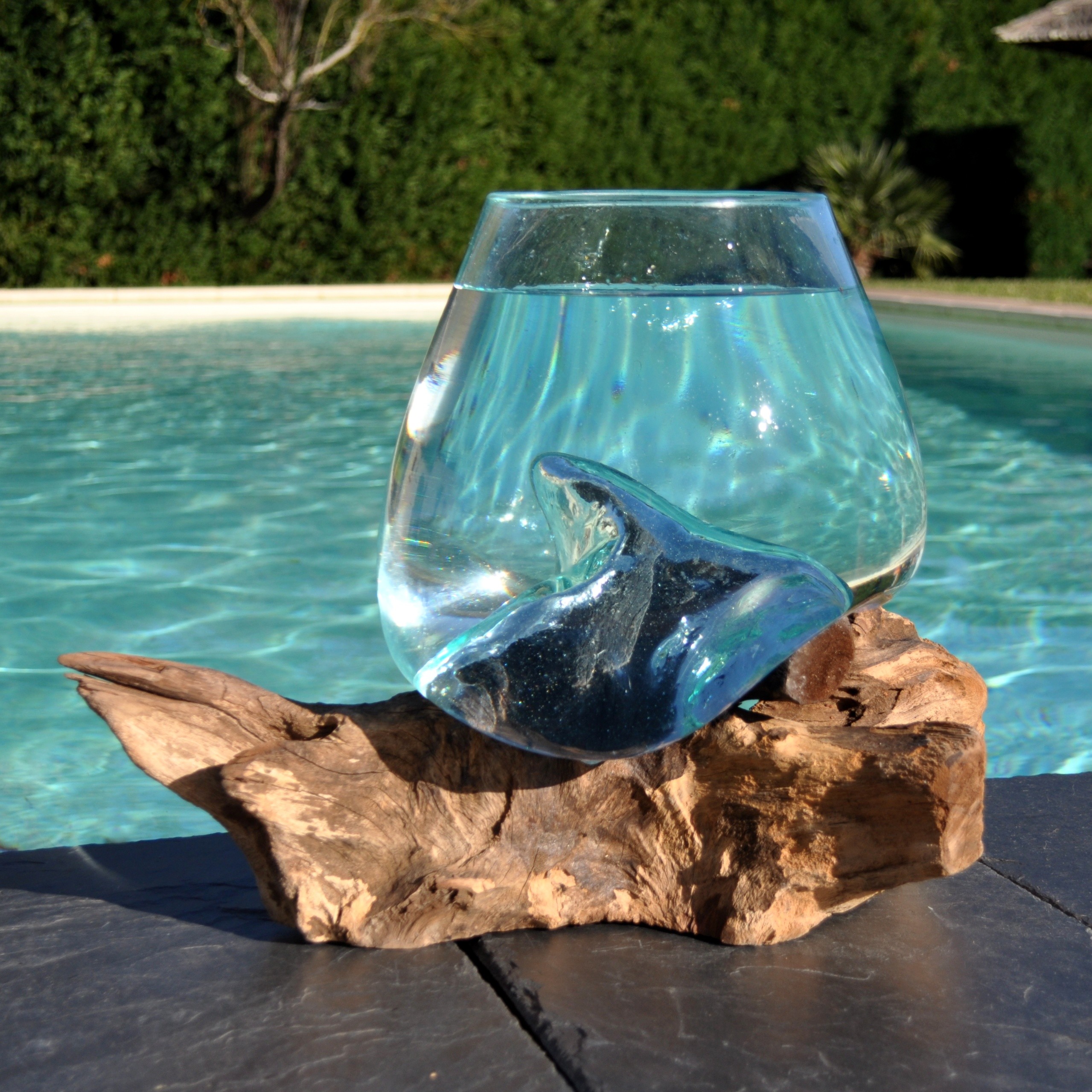 La pâte de verre provient de verre recyclé et est soufflée en fusion directement sur le bois.