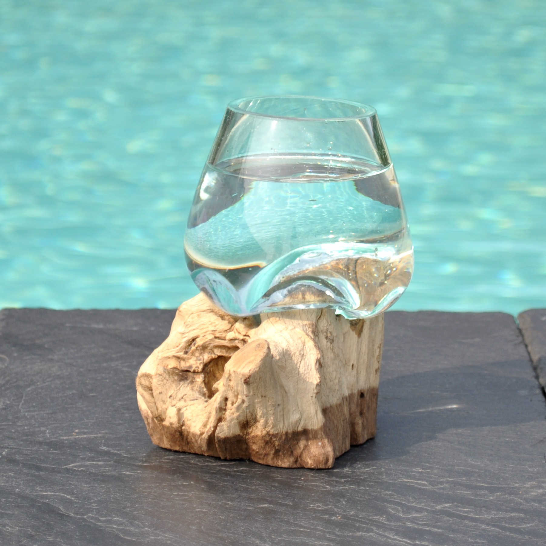 La pâte de verre provient de verre recyclé et est soufflée en fusion directement sur le bois.