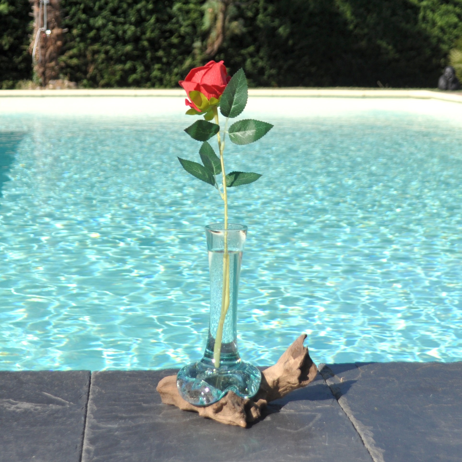 Notre sélection rigoureuse du verre à recycler nous permet d'obtenir un verre absolument transparent, ce qui, associé à son épaisseur donne ces magnifiques reflets bleus. La forme de son pied, confère au vase dont le verre a été soufflé en fusion à la bouche directement sur le bois flotté, une forme absolument unique, un peu magique même.