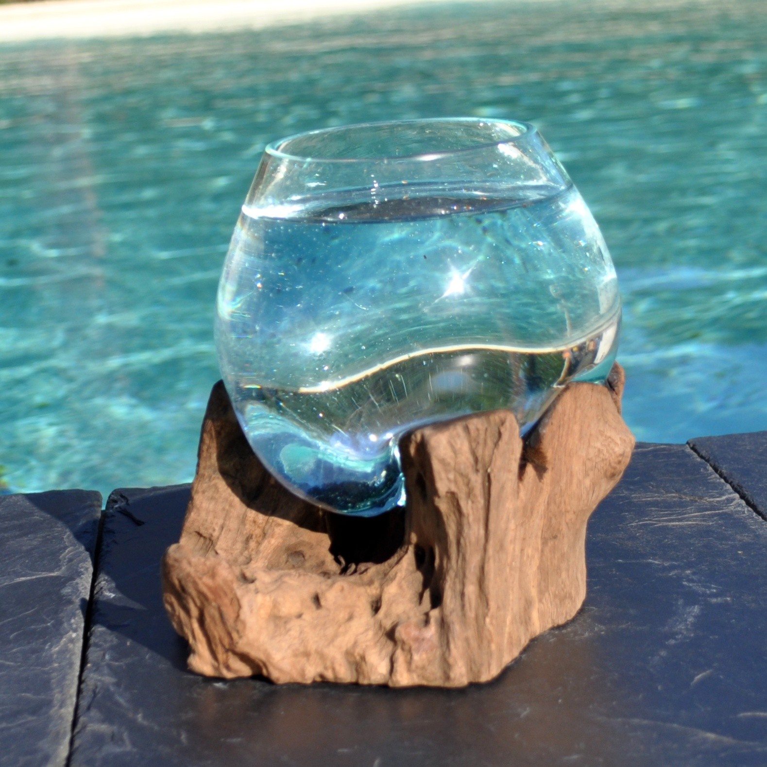 La pâte de verre provient de verre recyclé et est soufflée en fusion directement sur le bois.